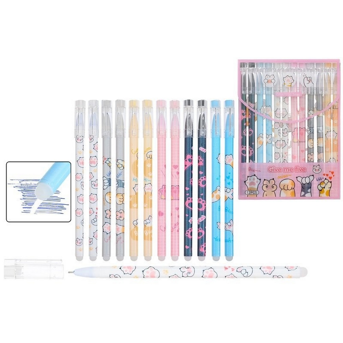 Ручка со стираемыми чернилами гелевая: "ЛАПКИ"; цветной с рисунком корпус /ассорти/; толщина пишущего наконечника-0,5 mm; цвет чернил-синий, в пластиковом блистере.