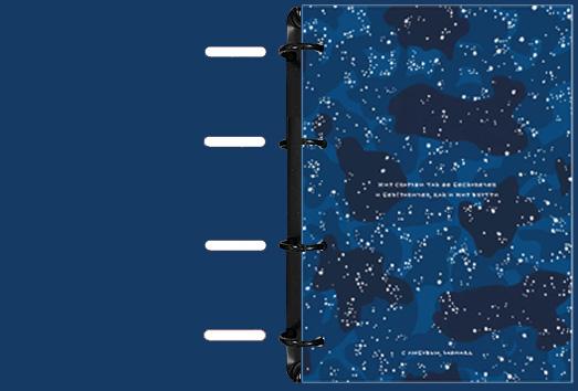 Обложка: снаружи и внутри - мелованный картон 250 г/м2, печать 4+4, микротекстурирование, ламинация, скругление углов. Кольцевой механизм.