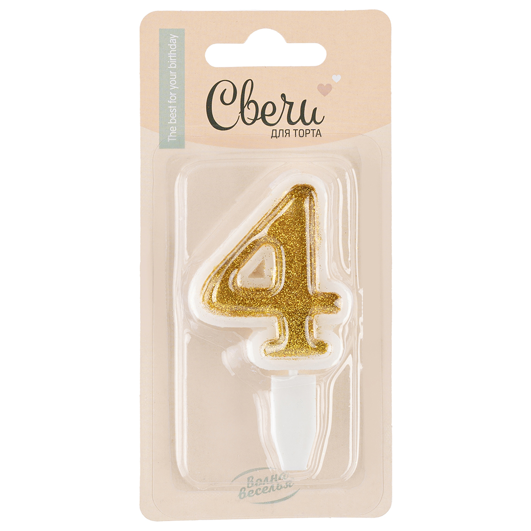 Свеча д/торта "Цифра 4" золото с блестками, 5см., держатель, блистер