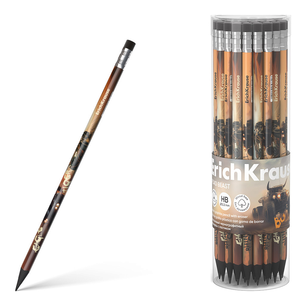 Карандаш ERICH KRAUSE "Road Beast" HB с ластиком, пластик, трехгран, чернограф., тубус