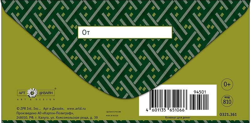Конверт д/денег Арт Дизайн "Орнамент зеленый" вырубка, 83х167мм.