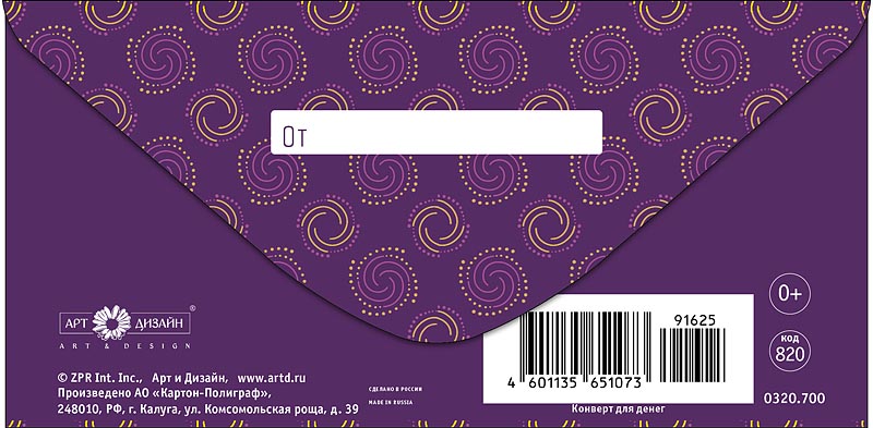 Конверт д/денег Арт Дизайн "Орнамент фиолетовый" вырубка, фольга, 83х167мм.