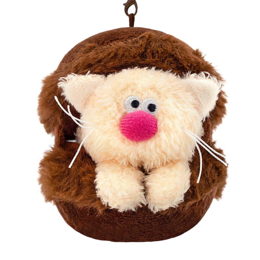 Забавный брелок в виде милого котёнка Сливки из тактильно приятного эко меха сливочного цвета. Котёнок лежит между половинками пирожного макаронс. Шоколадное пирожное сшито из софта и короткого меха цвета горького шоколада. У брелока удобный карабин шоколадного цвета с застежками, который можно отстегнуть.