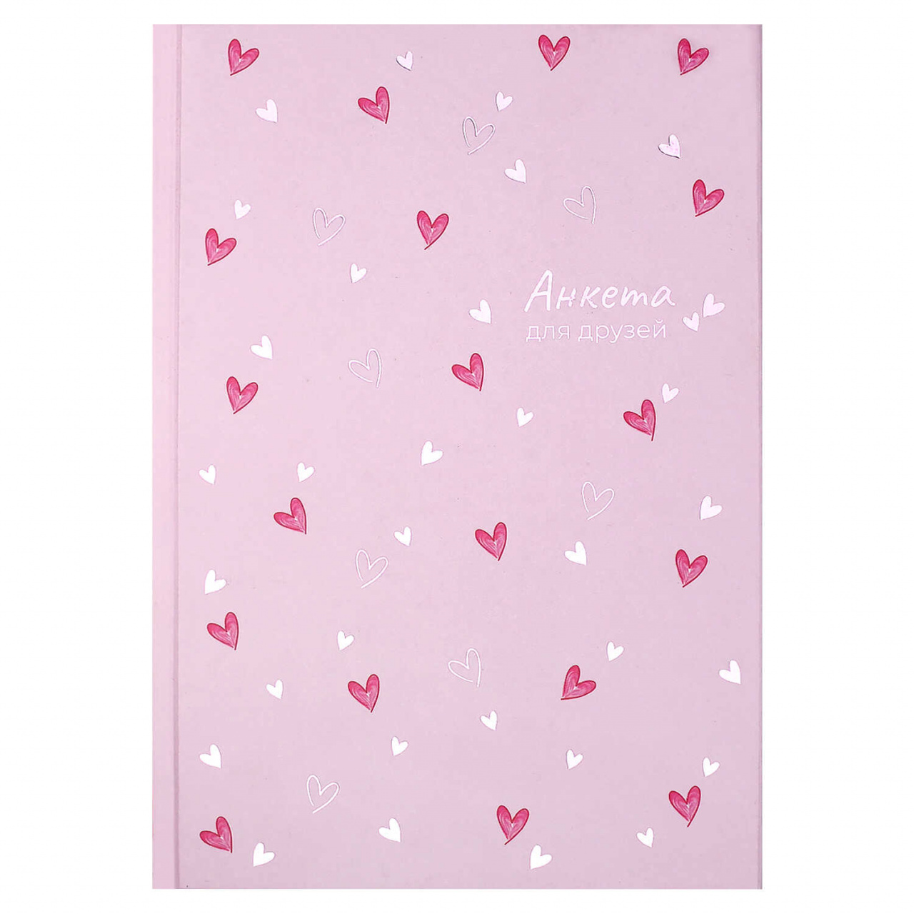 Анкета для друзей СЕРДЕЧКИ НА РОЗОВОМ / А5 (145х205 мм), 128 л., блок - печать в две краски, твёрдый переплёт 7БЦ, глянцевая ламинация, тиснение фольгой/