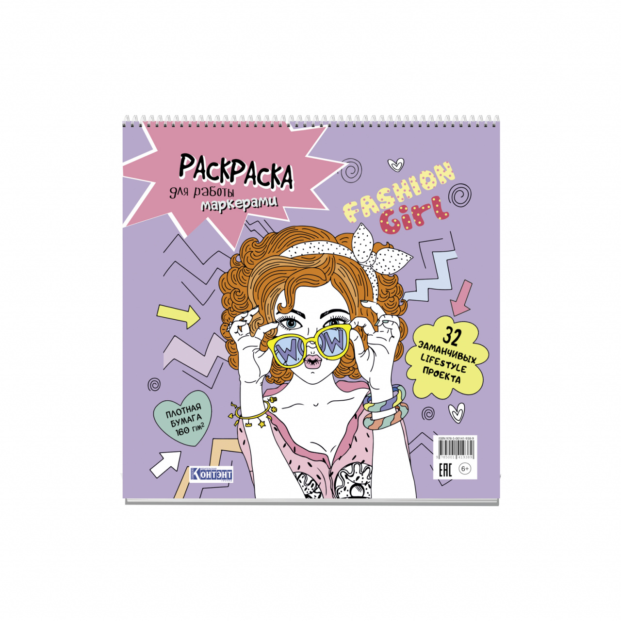 Раскраска Fashion Girl для работы маркерами (сиреневая обложка, девушка в очках)
