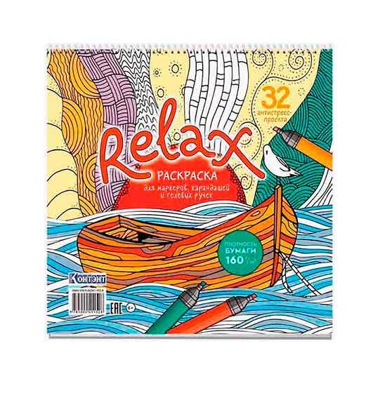 Раскраска-антистресс Контент 196х196 "Relax.Лодка и чайка" спираль, 32л, д/маркеров, жест.подл.