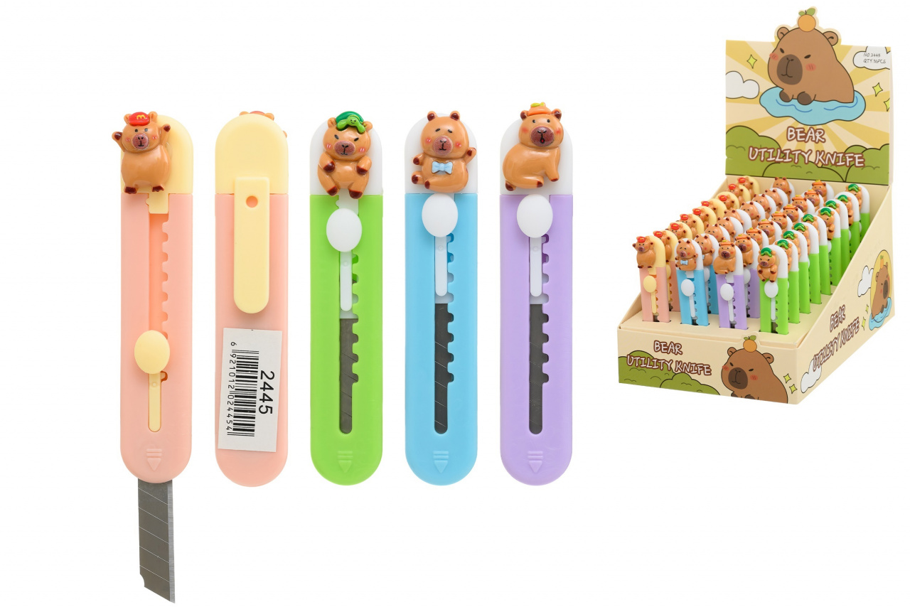 Нож канцелярский детский: "КАПИБАРА"; цветной пластиковый держатель с фигуркой-капибара, лезвие-4 см, размер 9см.