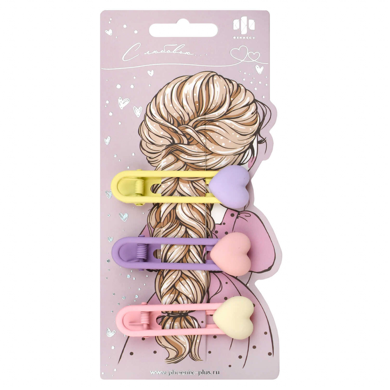 Набор заколок для волос ФЕНИКС "Сердечки" 3шт, 5,9см, металл, желтые, розовые, сиреневые, европодвес