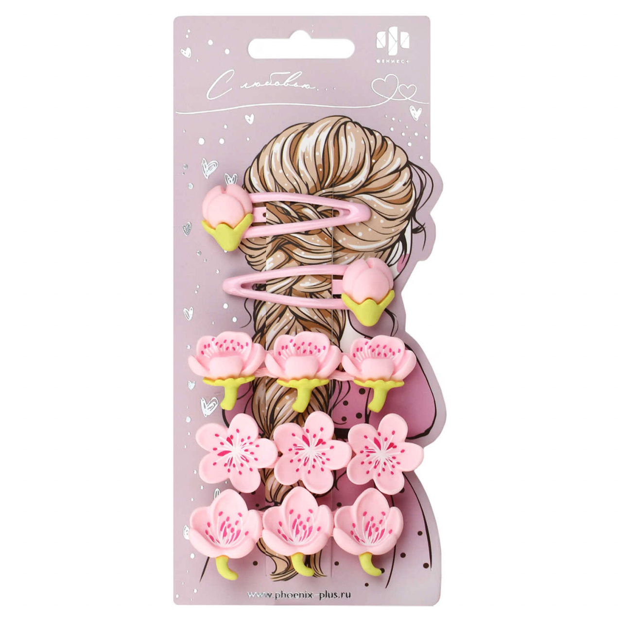 Набор заколок для волос ФЕНИКС "Цветочки" 5шт, 6,8см, металл, розовые, пакет, европодвес