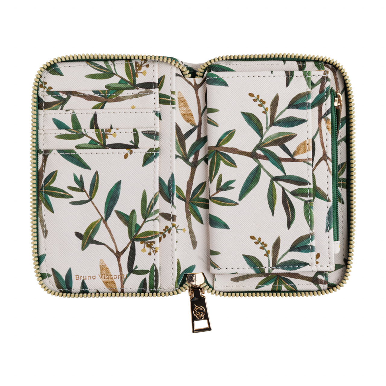 Кошелёк из коллекции Flora с чарующим узором. Компактный формат 14 × 2 × 9 см удобен для ежедневного использования, внутри 9 отделений для карт, одно для купюр и карман для монет.