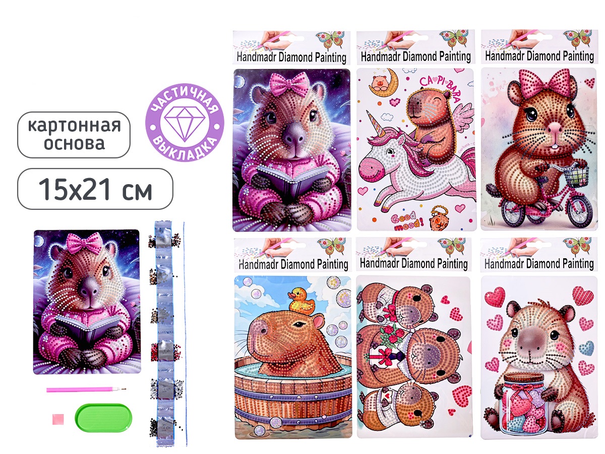 Алмазная мозаика КАПИБАРА, картонная основа 15х21 см, 6 дизайнов, частичная выкладка, ОПП-упаковка