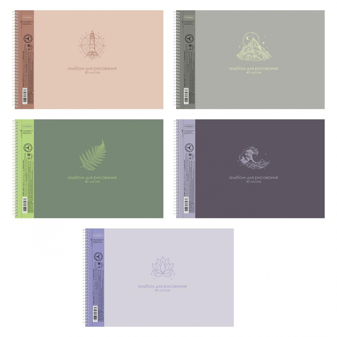 АЛЬБОМ для рисования 40л А4ф на спирали перфорация на отрыв Обл. мел.картон ламинация СОФТ ТАЧ и тиснение 5 диз.в блоке серия -Лаконично-