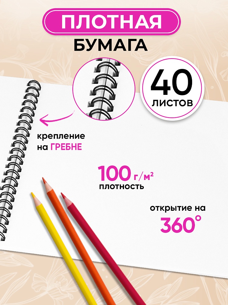 Альбом для рисования А4 40л. НЕЖНЫЕ ЦВЕТЫ - 23 2 диз. в сп., гребень, офсет