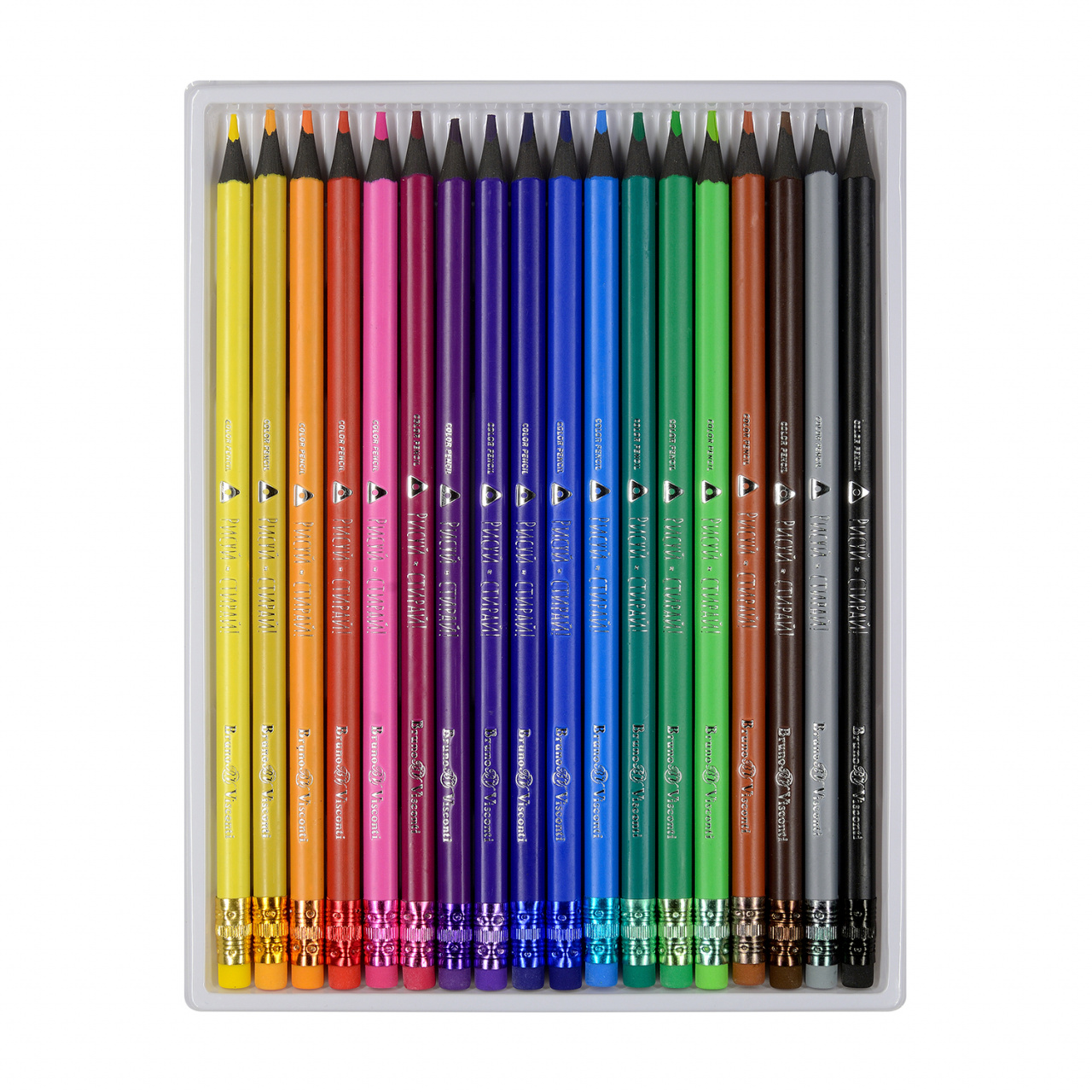 Всем хорош набор карандашей «РИСУЙ и СТИРАЙ» от Bruno Visconti: карандаши ярко рисуют и легко затачиваются точилкой, которая идет в комплекте. Ластик на кончике карандаша отлично стирает цветовые пигменты.