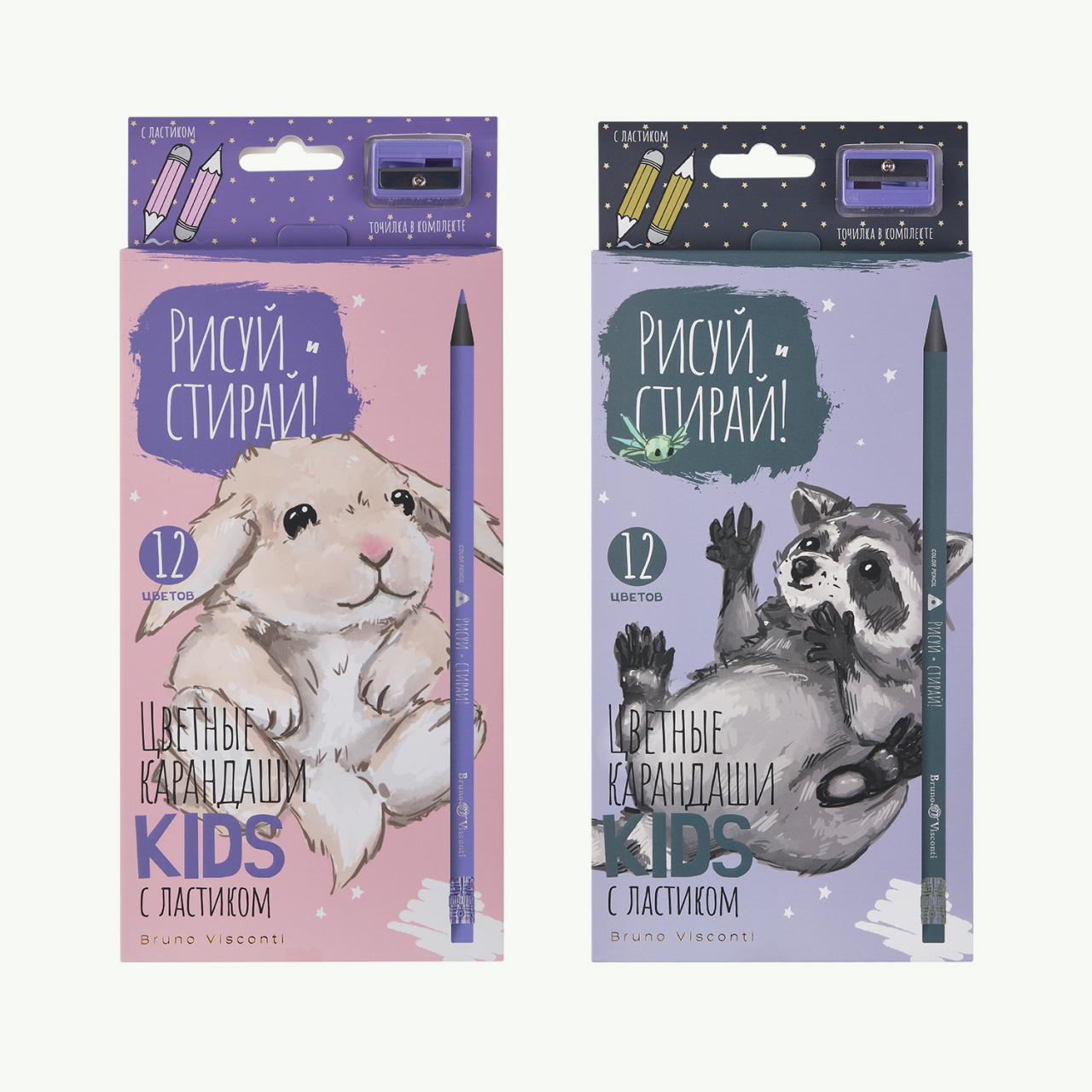 КАРАНДАШИ ЦВЕТНЫЕ "РИСУЙ и СТИРАЙ" (пластиковые с ластиком) С ТОЧИЛКОЙ, 12 ЦВ., 4 ВИДА