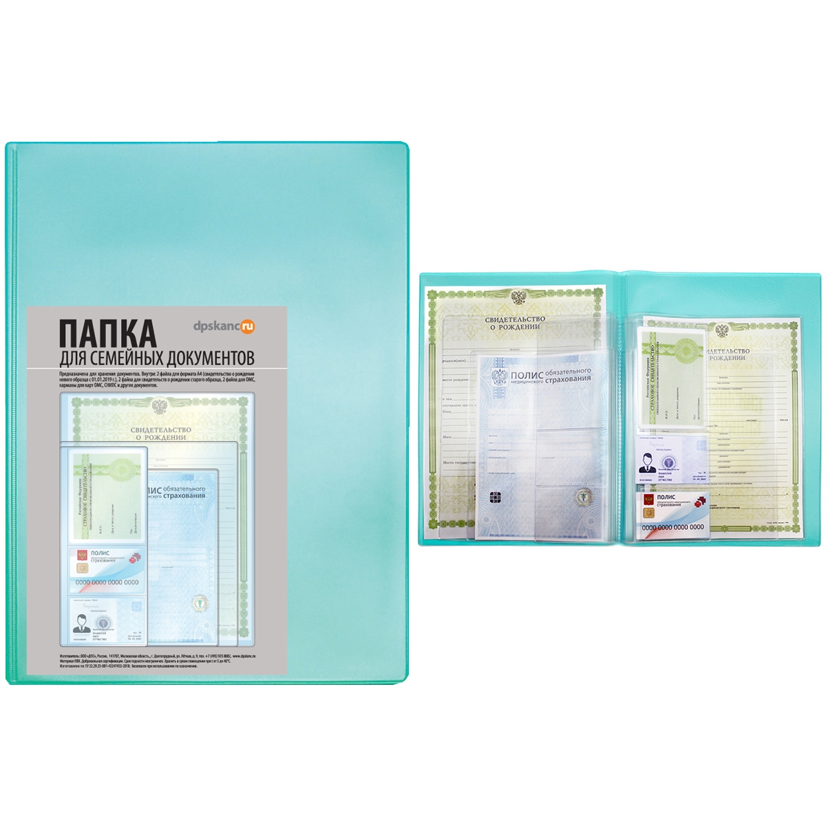 Папка для хранения семейных документов. Вмещает в себя: 2 файла для формата А4 (свидетельство о рождении нового образца с 01.01.2019 г.), 2 файла для свидетельств о рождении старого образца, 2 файла для ОМС, карманы для карт ОМС, СНИЛС и других документов.